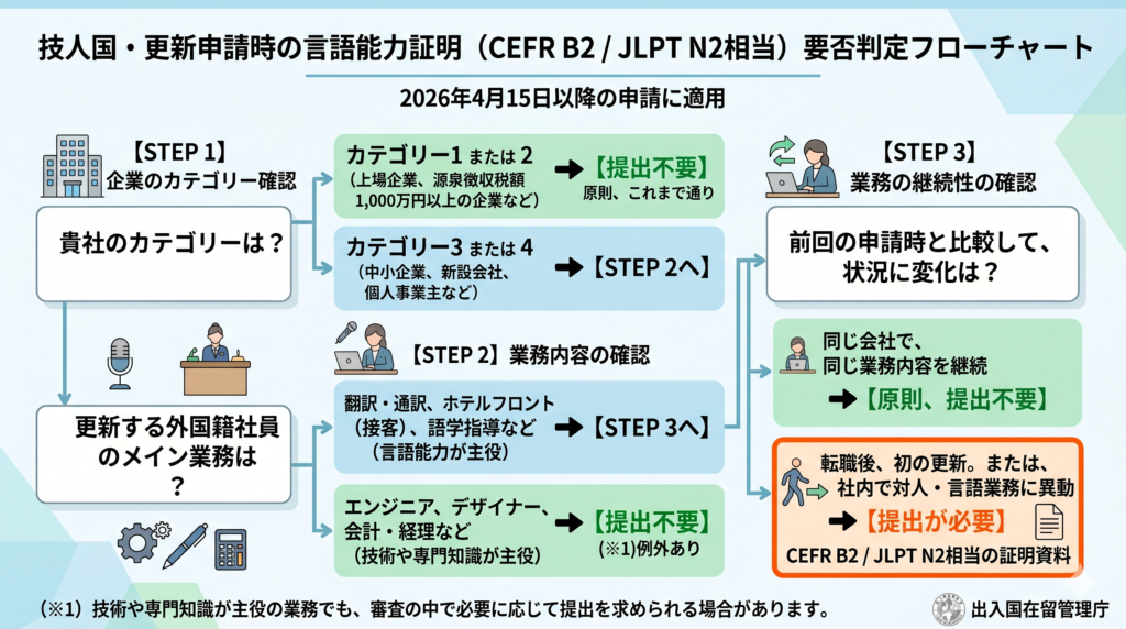 これまで「更新申請」では免除されることが多かった「言語能力の証明書類(JLPT N2相当)」が、特定の条件下で必須となりました。